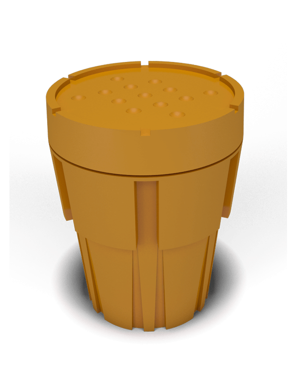 Materiales: Tapa con ranuras para un efectivo cierre. Molde con rebordes para facilitar el enganche y manejo. Su boca permite el acceso de garfios para levantar el envase de su interior. 100 % polietileno con U.V. Resistente a la corrosión.